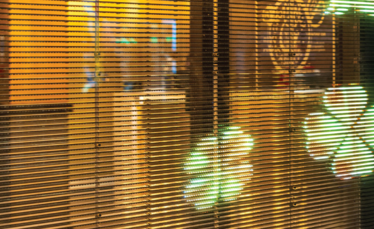 Transparent LED technology provides an effective and striking alternative to Large Format LED Screens. The image on the screen is created by programming LED’s to work seamlessly, displaying the relevant pixel colour on the mapped LED’s which then combine to create an image. This see through LED effect is especially powerful when integrated into a glass façade, allowing designers to offer a screen solution for retail buildings with a focus on glass architecture without detracting from the overall design.