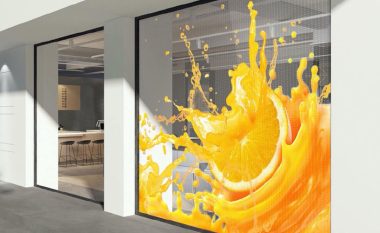 The display uses a self-adhesive layer that allows it to be applied directly to existing glass without the need for complex steel frames or heavy mounting hardware.