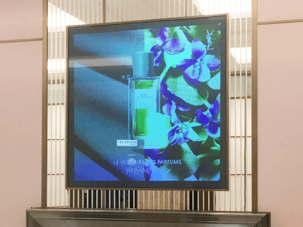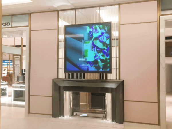 Choosing an LCD or LED screen as their signage solution would usually force content into a typical aspect ratio such as 16:9. In a busy retail environment, a traditional aspect ratio may be less effective when competing with other screens and could contribute to a condition of ‘inattentional blindness’ that can affect audiences who are faced with a number of competing visual distractions. Being housed in their own bespoke luxury frame, this rear projection screen blends seamlessly with the environment’s interior design yet stands out effectively as their own piece of moving art with its own light source.