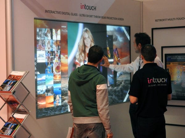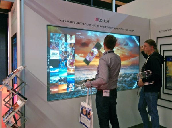 Our ultra-short throw rear projection screen is now available in single sizes up to 8 metres by 3 metres for extra large format displays. With toughened glass and lightweight acrylic options, Digital Glass offers a robust, cost effective and space-saving screen solution. Digital Glass integrates perfectly with infrared touch frames too, with up to 32-point multi-touch. The screen on our stand had 6-point multi-touch, was rear-projected by NEC’s U321H 1080p UST projector, and used the brilliant Touchtech Lima interactive multi-touch software package: