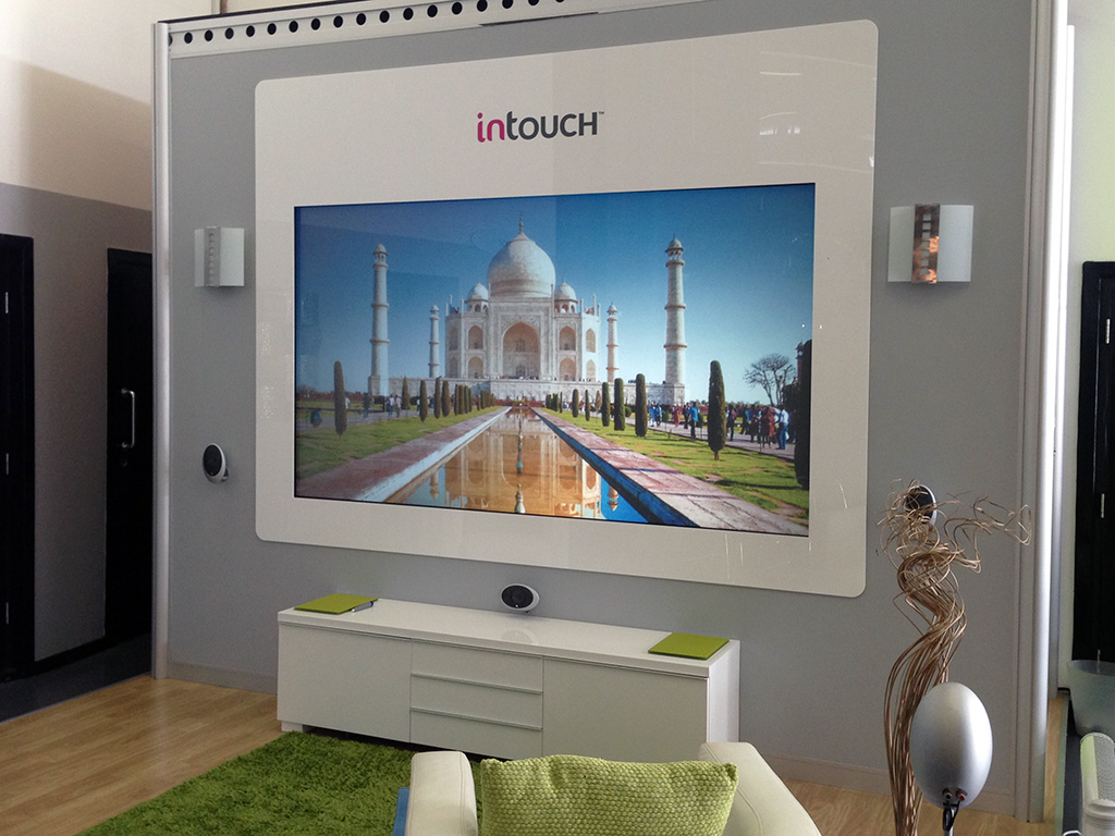 The test screen is mounted in our Screen Gallery in Leeds (UK), measures 100″ along the diagonal and is made from toughened glass. This particular screen also has our intouch infrared multi-touch frame fitted on the perimeter, which explains the branding.