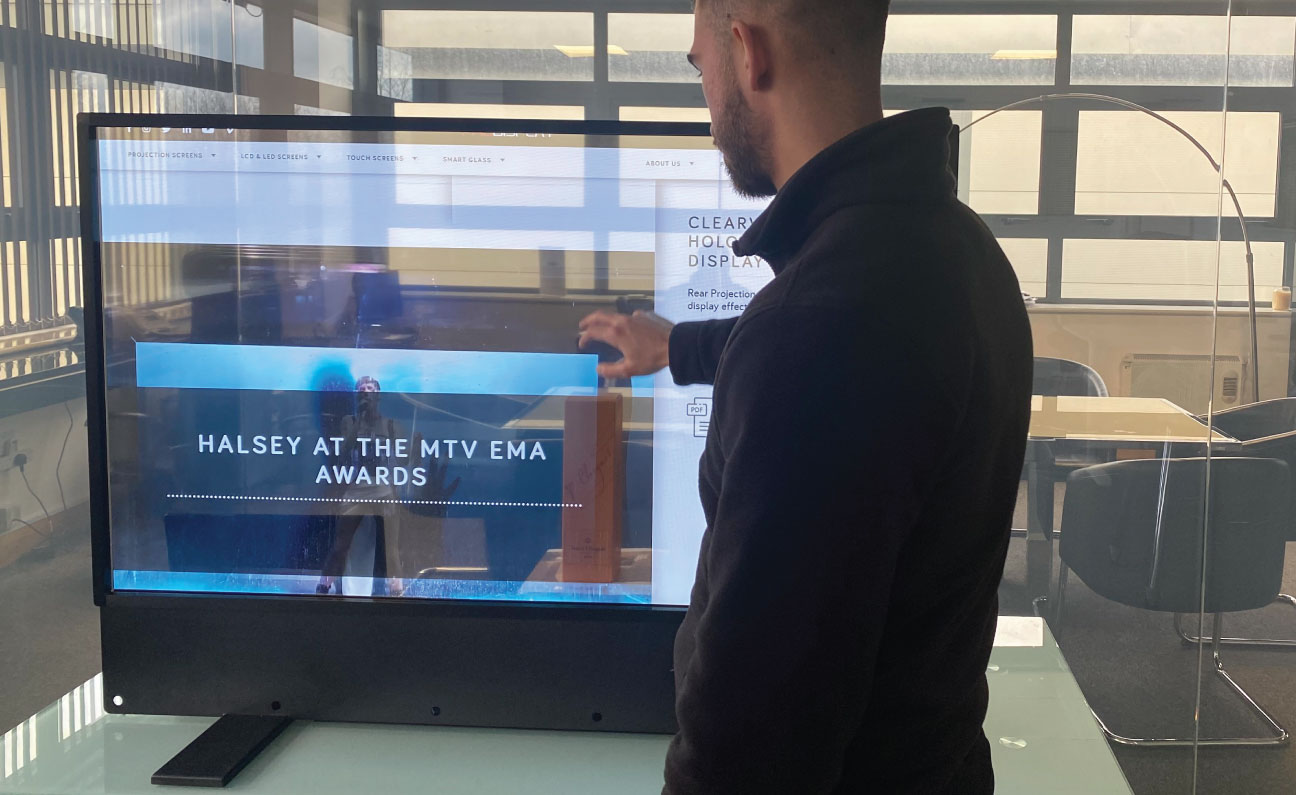 For projection applications, our Clearview Interactive Projection Touch Foil can be applied to windows to create interactive window displays using through glass touch. For a more versatile screen solution our Interactive Switchable Glass Screens provide a HD/4K image canvas when turned off and a holo effect image when switched to clear.